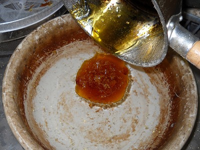 水の中に熱い松やにを流し込む! 細かい飛沫が飛び散って、熱っ、熱っ、熱っ、熱っ! これを熱いうちに手で丸めるのですが、さすがに画像にできません。気温で硬さが変わるので、こまめにチャンは炊かなければいけません。地味に大事な下ごしらえです。
