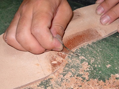 今日は文化の日です。というわけで、朝から文化的(?)に中底加工をしました。前日に木型に合わせてクセ付けしておいたので、包丁をよく砥いだら、中底を切り回すところから始めます。