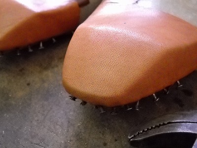 「手製靴」というふれこみで表に出ていると、意外に多いのが、「これも手縫いですか?」と甲革を指差されることです。さすがに30番のナイロン糸を1.5mm弱のピッチで手縫いするのというのは無理なので、製甲はミシン仕事が中心です。