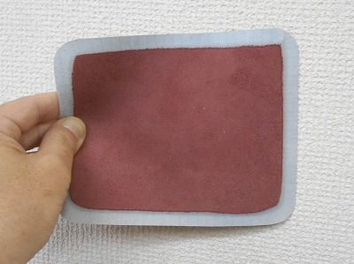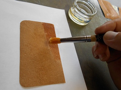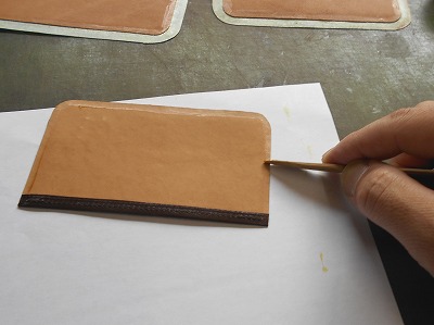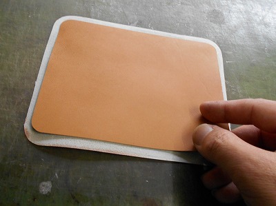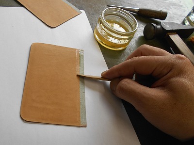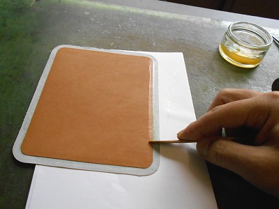 表革の裏面全体にゴム糊を塗ります。