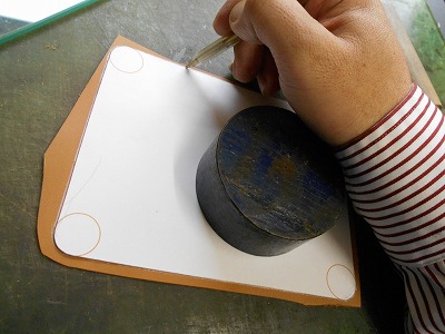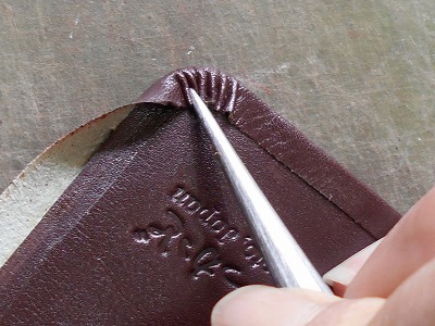 角の折り込みは、余計な革をひだにして貼り込んでおきます。