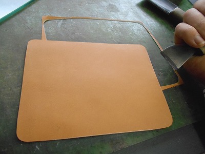 手漉きして革が伸びてしまった部分は、包丁で切り揃えておきます。