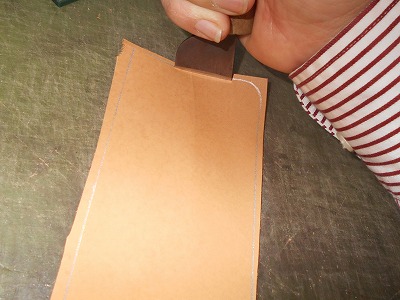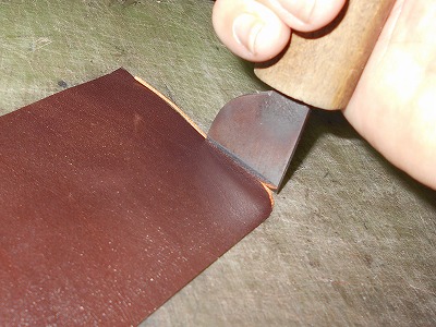 漉き幅を変えて、周囲も漉きます。本体の端を織り込んだときに、革が重なる部分を薄くしておいて、すっきりとした雰囲気を目指します。