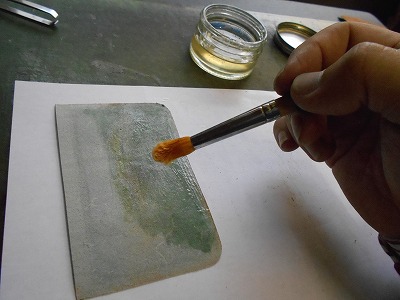 カードの差し込みのパーツも、接着面の銀面を荒らして、糊を塗ります。