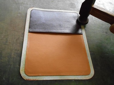 改めて張り込んだ部分を叩いて、確実に仮止めしておきます。パーツがずれたまま縫製してしまうと、取り返しがつきません。革に穴を開けてしまうと、元には戻らないのです。