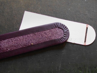 折り返して糊付けする部分の銀面を、紙やすりで荒らしておきます。革の銀面は組織が緻密なので、糊が利きませんから。