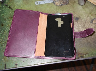 今回は、ミネルバリスシオのプルーラ(紫色)でのお仕立てです。金属製の金具や磁石は事故の心配があります。スマホケースにはベルクロ(マジックテープ)が相性が良いのですが、ベルクロの寿命とか、髪の毛の噛み込みとか、不快な要素が気になります。強い締結力を必要とはしないので、止め具には簡単なベルトループを採用しています。