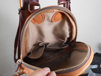 形優先のデザインですから、容量は少ないですし、使い勝手は度外視です。せめて中にポケットを設ける程度。修理しやすさを念頭に、根革を手縫いしているのが当工房らしい。素材は本革高級品。手作り品の一品物です。